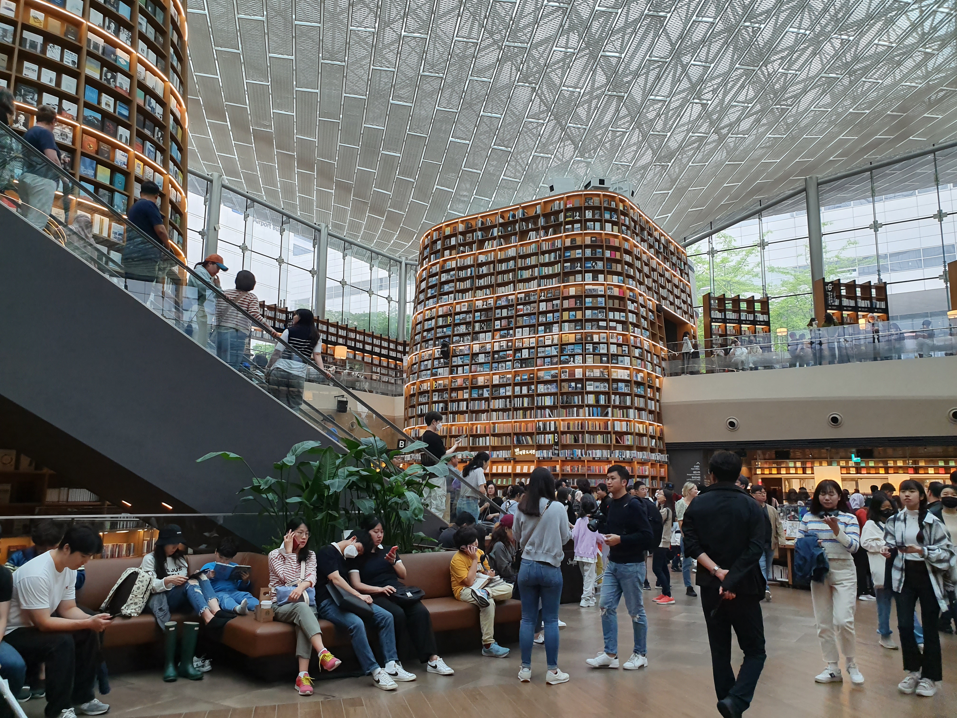 그리고 1층, 2층을 이동할 때에는 에스컬레이터가 있어서 효자손 노릇을 합니다. 도서관을 2층에서 내려다본 느낌은 1층과 또 다르기 때문에 올라가 볼 것을 추천합니다. 그리고 저녁때에는 노란색 조명이 켜져서 밝은 분위기에서 따뜻하고 부드러운 분위기로 바뀌어서 멋있습니다.