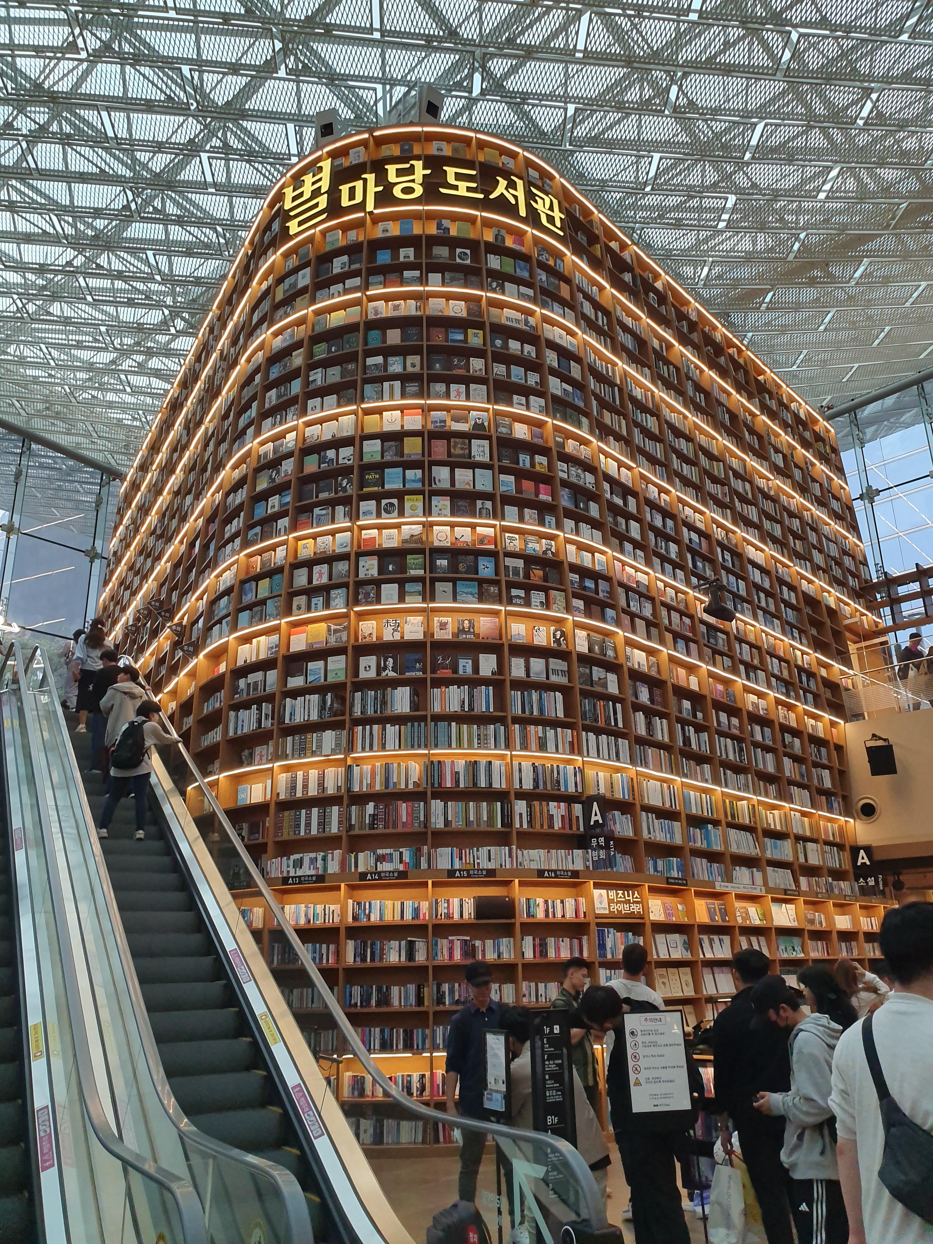 '헨젤과 그레텔' 동화책 속에는 과자집이 있듯이, 별마당 도서관에는 책으로 만든 집이 있습니다. 책장 크기가 정말 거대합니다. 별마당 도서관에는 관광을 하러 온 외국인들도 많았는데, 멋진 도서관 인테리어에 감탄하며 사진을 찍느라 바쁘게 보였습니다. 책을 천장까지 쌓은 생각이 외국인들의 발길을 사로잡는 것을 보면서 한국인으로서의 자부심도 느꼈습니다. 참 훌륭한 생각입니다. 별마당 도서관은 전체 2층으로 되어 있습니다.