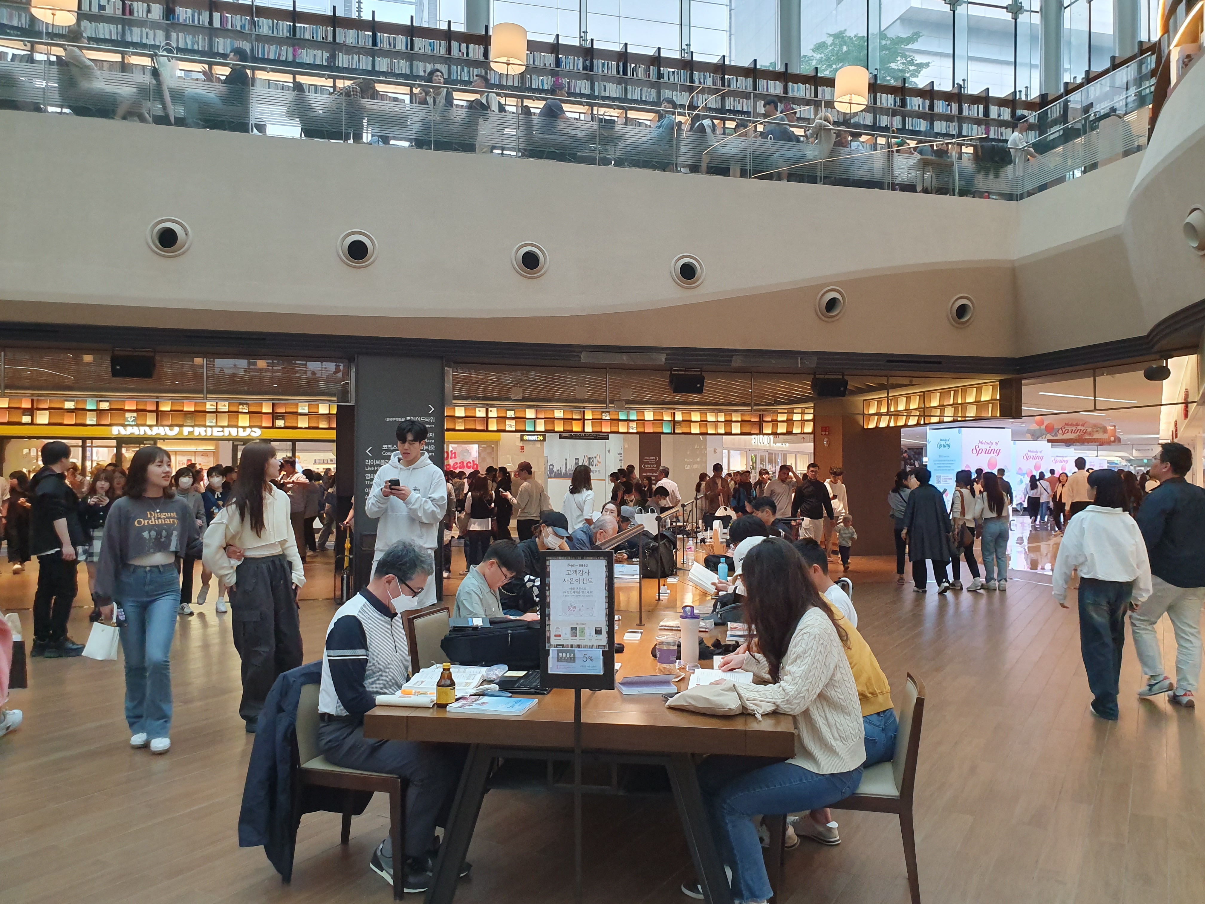 2층에 올라가면 난간을 둘러싸고 책상이 있습니다. 이곳은 독서와 함께 도서관 전체 분위기를 한눈에 감상할 수 있는 장점도 있습니다. 이렇게 다양한 자리가 있으므로 원하는 자리에서 즐겁게 독서를 하면 됩니다. 주말에 책상에 앉아서 독서를 하고 싶다면 사람들이 많으므로 일찍 가서 자리를 맡는 게 좋을 것입니다. 하지만 한 가지 팁을 드리자면, 1층 계단식 벤치는 사람들의 이동이 원활해서 자리가 금방 난다는 것입니다.